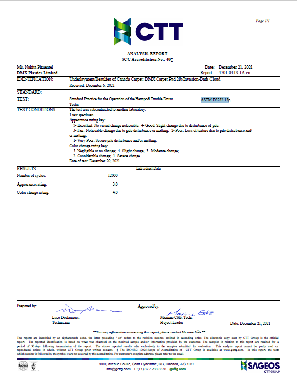 DMX Carpet Pad has established itself as the best and most tested underlayment in the industry. You can buy our products with confidence, knowing that they have passed the most exacting standards set out by the flooring industry. The tests results have been validated by reputable, world class labs. The results are shown below to provide complete transparency.